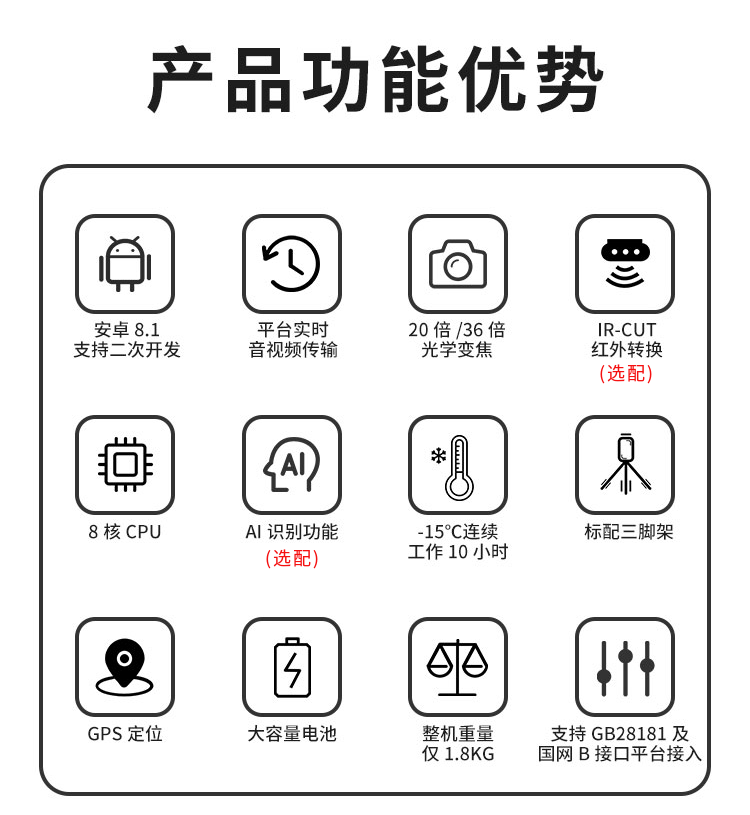 4G高清AI智能布控球 * AI智能識(shí)別,更清晰·快傳輸·識(shí)強(qiáng) * 輕量化,整機(jī)重量?jī)H1.8KG * Android 8.1 8核,20倍/36倍光學(xué)變焦 * AI智能識(shí)別,可人臉識(shí)別、車輛識(shí)別、安全帽識(shí)別、工服識(shí)別、銘牌識(shí)別等等。 * 2T大容量,支持雙sim卡、雙t卡,最高2T內(nèi)存 * 在線傳輸,作業(yè)現(xiàn)場(chǎng)隨時(shí)看,可視化平臺(tái)調(diào)度指揮 * 電子地圖實(shí)時(shí)檢測(cè)人員、設(shè)備、事件、區(qū)域信息 * 第一時(shí)間掌握現(xiàn)場(chǎng)情況,遠(yuǎn)程決策,統(tǒng)一協(xié)調(diào)?