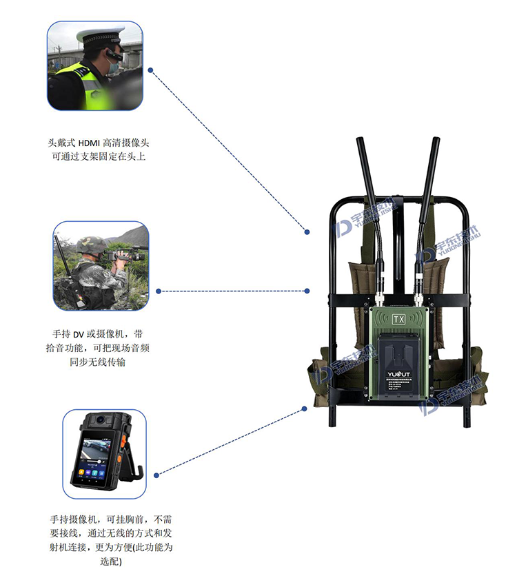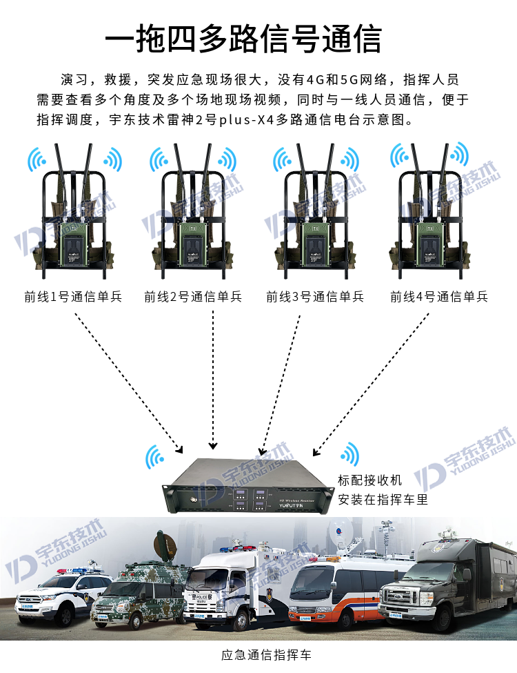 宇東技術(shù)雷神2號plus-X4一拖四背負(fù)式高清無線圖傳電臺,是應(yīng)對突發(fā)事故,斷網(wǎng)斷電,如地震、洪災(zāi)、反恐、應(yīng)急救援、部隊演習(xí)等使用通信,本設(shè)備由4路背負(fù)式單兵發(fā)射機電臺和1臺四路接收于一體的接收電臺地面指揮箱組成,指揮箱自帶四路接收模組和顯示器及功能按鍵,可同時接收四路發(fā)射機的視頻和對講信號數(shù)據(jù),指揮箱自帶揚聲器,可接收DV無線發(fā)送現(xiàn)場的聲音數(shù)據(jù)。支持?jǐn)U展HDMI外接顯示大屏及插USB錄像保存功能,真正義意上做到及時取證,錄像保存,移動通信,統(tǒng)計指揮調(diào)度等。